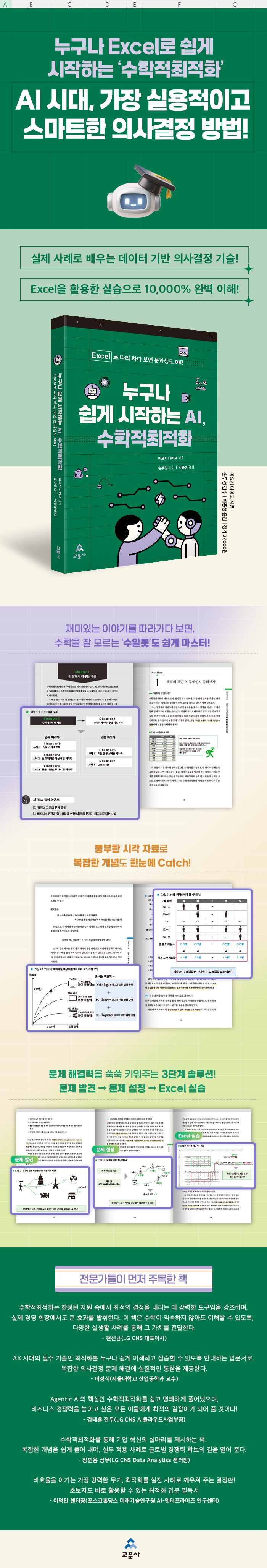 이 책이 주목하는 지점도 바로 여기에 있다. 지금까지 수학적최적화는 전문가나 엔지니어만이 다룰 수 있는 영역으로 여겨져 왔다. 이는 복잡한 수식과 알고리즘, 고도의 프로그래밍 능력이 필요하다고 생각되었기 때문이다. 하지만 시대는 변했고, 이제는 누구나 접근할 수 있는 도구들이 등장했다. 그 대표적인 예가 바로 Excel이다. 이 책은 Excel의 ‘해 찾기’ 기능을 활용하여 누구나 손쉽게 최적화 문제를 실습할 수 있도록 구성되어 있다.